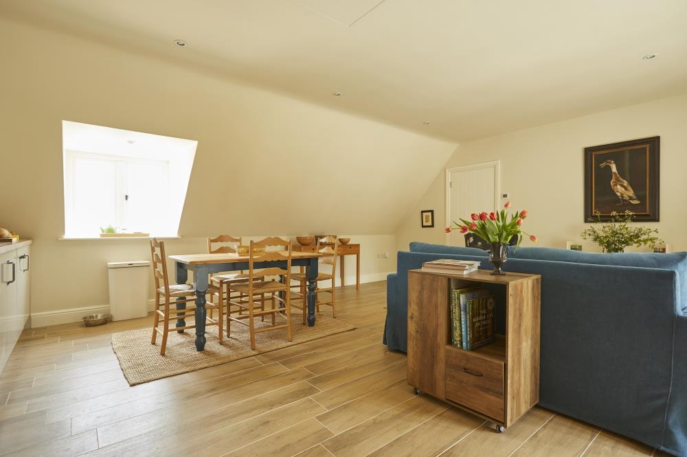 The flat looks out over our fields to the west and towards the village of Child Okeford half a mile away. Although there is no garden you very much feel in the country. You can see the church tower and the village roofs in the distance. It is a lovely retreat and a base to explore Dorset.